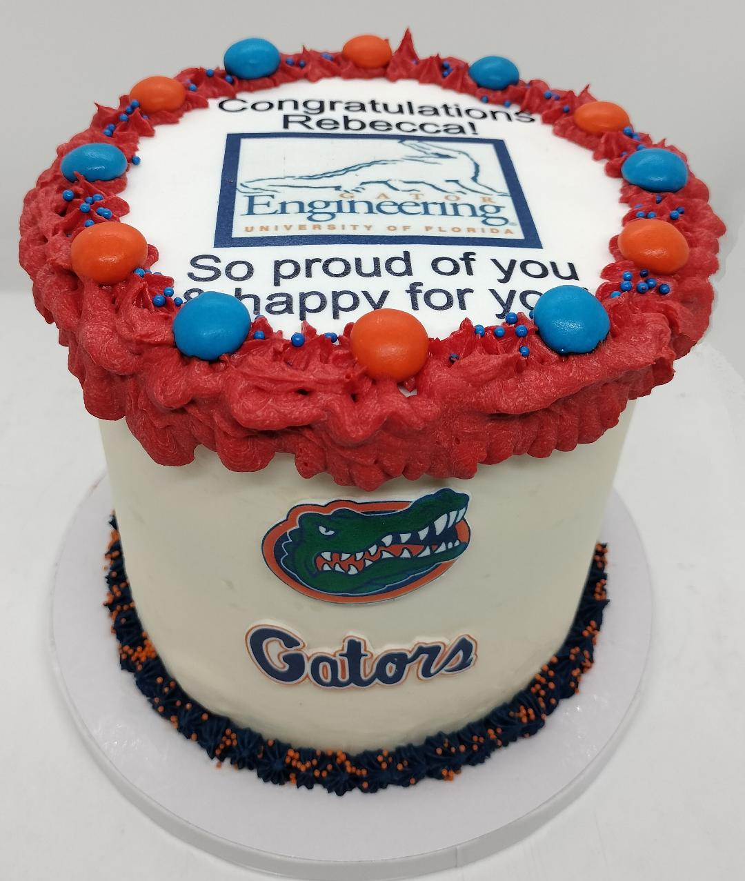 Wasn't sure about ordering from someone I had not used but read the reviews and took a chance. The UF cake was beautiful, it has the Gators on it and the school of engineering logo plus my daughters name. It was beautiful. Then we cut it and tasted it. It was sooo delicious. All my daughter's friends wanted to know where I ordered it. I highly recommend. You will not be disappointed!