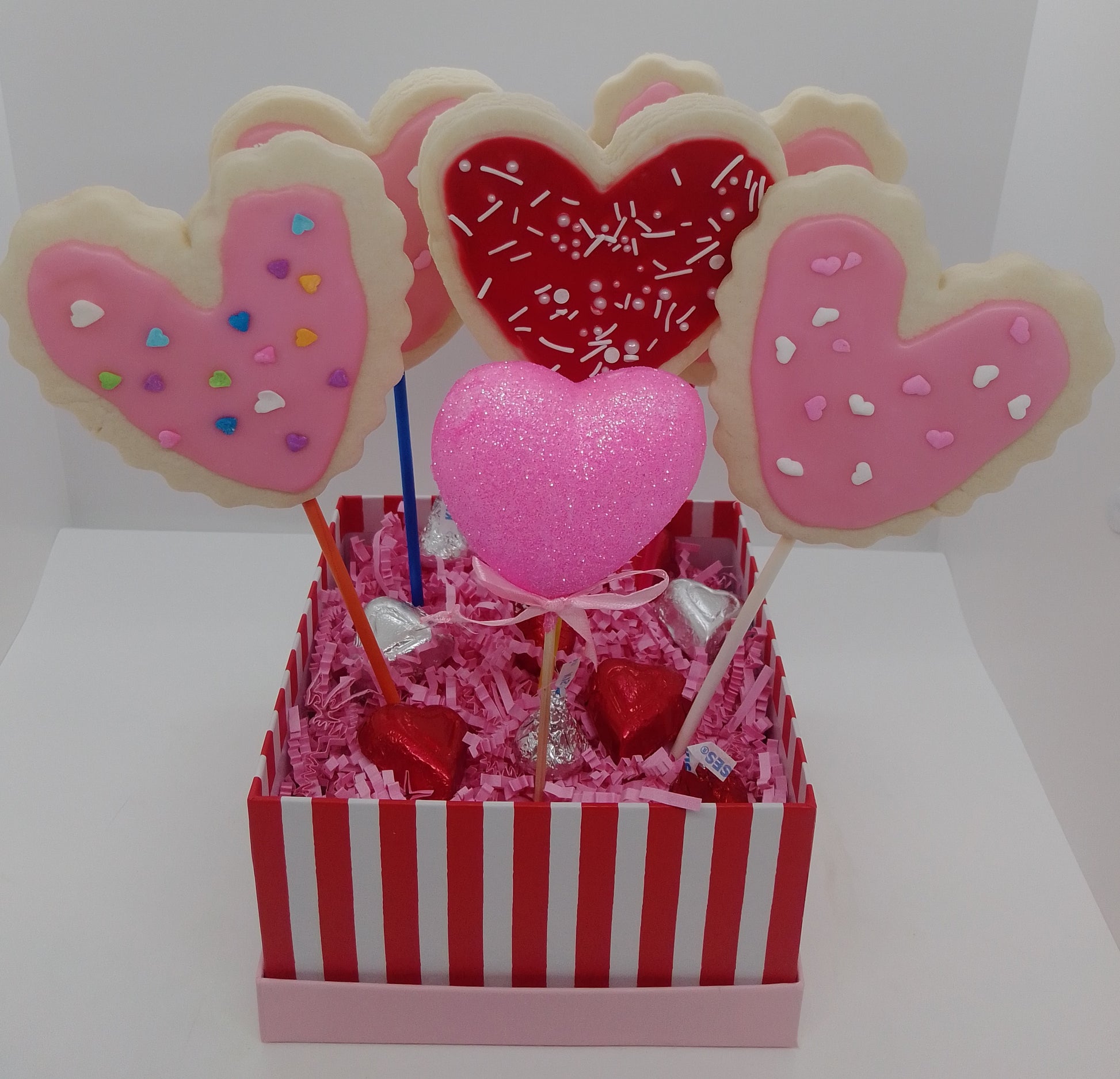 Send some love with our Valentine Cookie Basket. Delicious homemade sugar cookies in a gift basket is the perfect gift for your sweetie (or yourself - we won't judge). Indulge in a little love this Valentine's Day! And, we deliver. Sprinkle some Valentine magic with a sweet chocolate rose to your order.